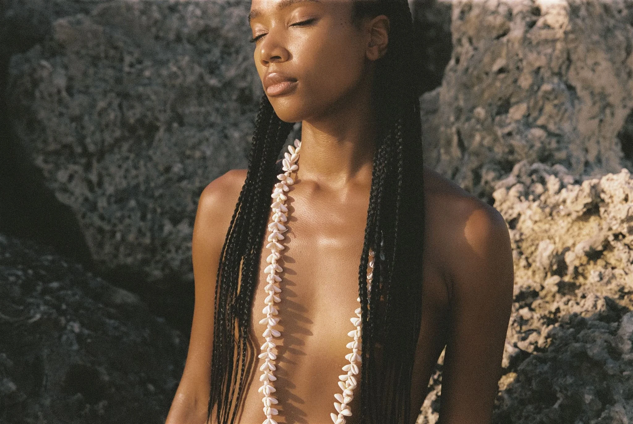 Fashion photography, 35mm film, vogue, fashion editorial, swimwear campaign, woman with shells, woman at the beach, high fashion editorial